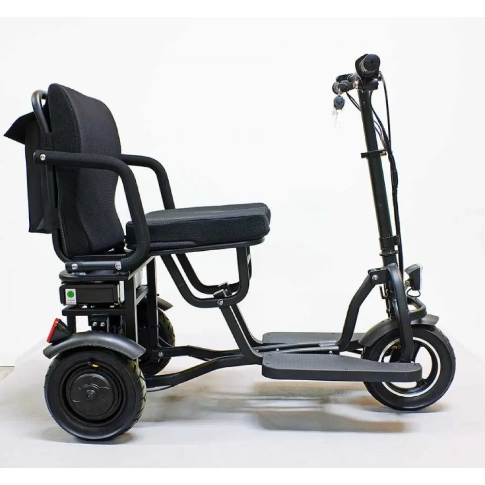 Водительское сидение широкое, имеет специальное воздухопроницаемое покрытие, позволяет длительное время находится в дороге. Техника представлена складной конструкцией, дает возможность легко транспортировать и брать с собой в путешествие. Мощность надежного двигателя 700 Вт позволяет развивать максимальную скорость 25 км/час за короткий период. Заряда емкого аккумулятора достаточно для прохождения 20 км пути без подзаряда. Современная технология изготовления батареи позволяет быстро заряжать, рассчитана на 1000 циклов заряда/разряда.