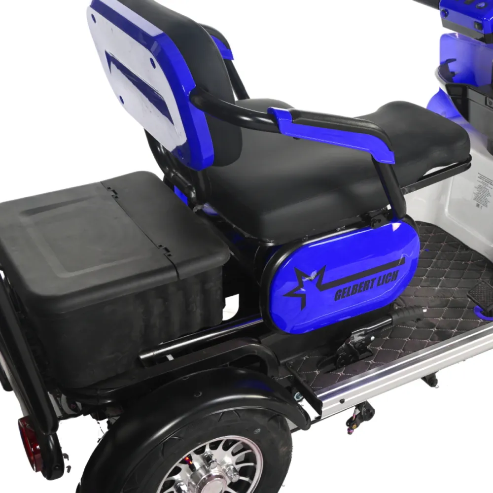 Электротрицикл Rutrike Gelbert Lich 48V/60V 600Вт – это современное средство передвижения, созданное для комфортных поездок по городу и за его пределами. Разработанный брендом Gelbert, этот электрический транспорт привлекает внимание своим стильным синим цветом и продуманной конструкцией, которая сочетает компактные габариты с надежной функциональностью.Двигатель мощностью 600 W, работающий при напряжении 48/60 V, обеспечивает плавное и стабильное ускорение, позволяя без труда преодолевать городские маршруты и небольшие подъемы. Несмотря на вес в 120 кг, электротрицикл демонстрирует высокую устойчивость благодаря оптимально подобранным 8‐дюймовым колесам, обеспечивающим хорошее сцепление с дорогой.Компактные размеры в собранном состоянии (178×76×103 см) делают этот трицикл маневренным даже в условиях узких улиц и оживленного трафика. Классическая барабанная тормозная система разработана для надежного и своевременного замедления, что повышает уровень безопасности при движении.Электротрицикл Rutrike Gelbert Lich не только функционален, но и эстетически привлекателен – синий оттенок корпуса подчеркивает его современный дизайн, а тщательно продуманные линии делают модель заметной и стильной. Это устройство идеально подходит для тех, кто ищет экологичное и экономичное транспортное средство для повседневных поездок, не теряя при этом в качестве и комфорте.Выбирая Rutrike Gelbert Lich, вы получаете надежное транспортное средство, способное сочетать динамичное передвижение, высокую маневренность и продуманную систему безопасности, что делает каждую поездку не только удобной, но и безопасной.