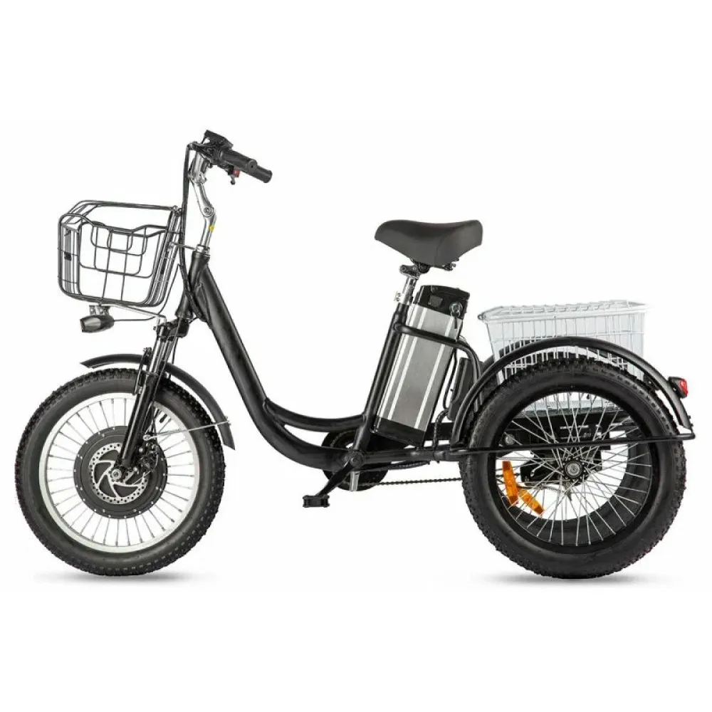 Покупка техники обещает эмоциональное удовольствие и помощь при транспортировки тяжелых предметов. При максимальной грузоподъемности 120 кг электровелосипед со скоростью 30 км/час без труда преодолевает 70 км пути. Указанный показатель максимальный среди трициклов.