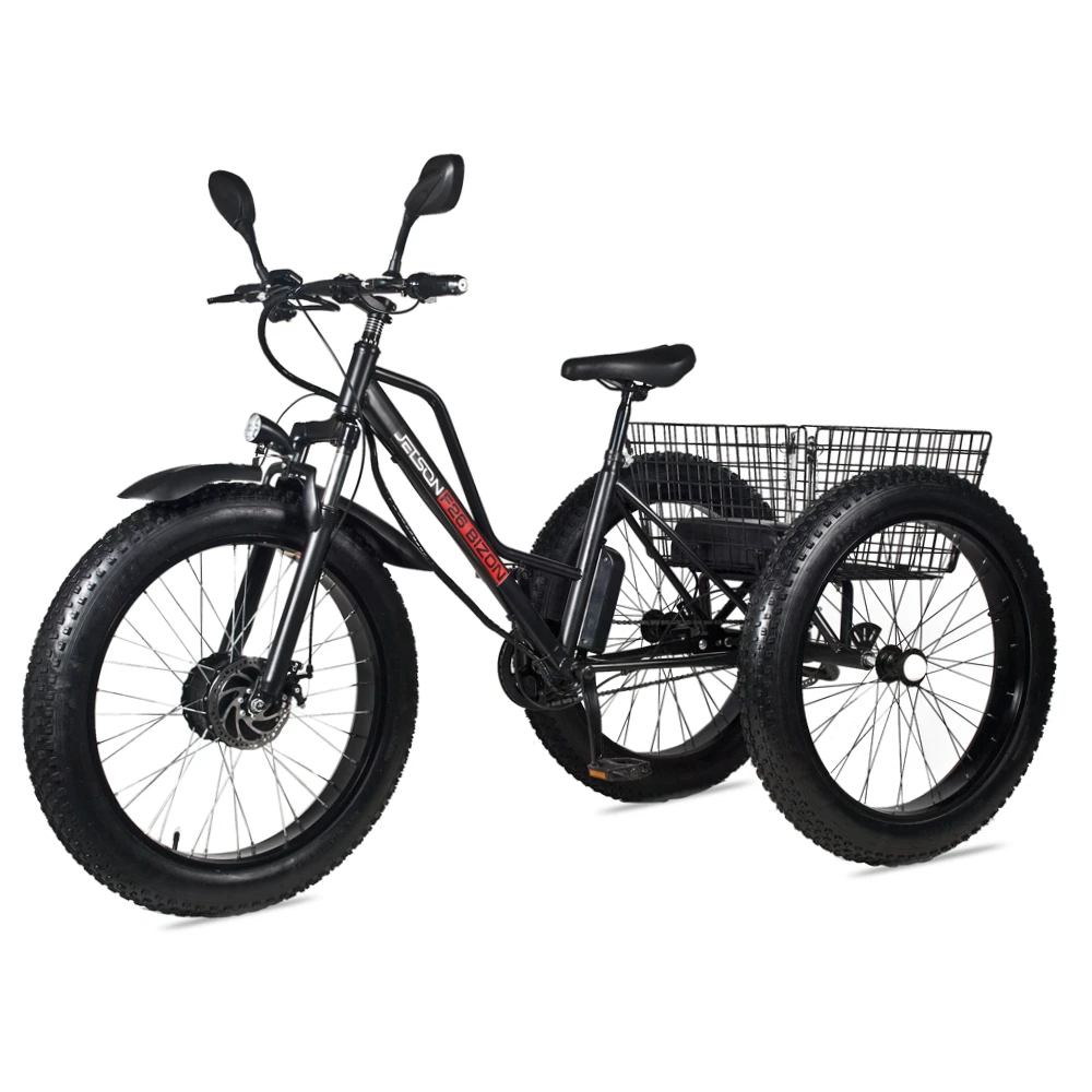 Электровелосипед Трицикл Jetson F26 BIZON (48V12Ah) черный с практической точки зрения выгодный для жителей сельской местности и собственников коттеджей, расположенных в отдаленности от города. Купить трицикл грузоподъемностью 200 кг вместимостью 1 чел. по цене производителя предлагает наш интернет-магазин.