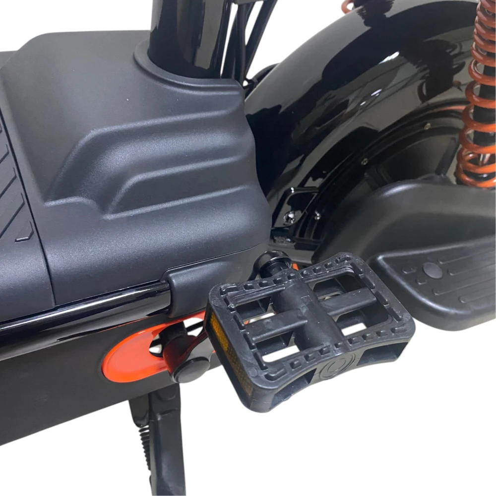 • Отличия от классических эл‑самокатов: полноценная рама, два сиденья, корзина, спинки и зеркала – это как гибрид городского электровелосипеда и компактного электроскутера.