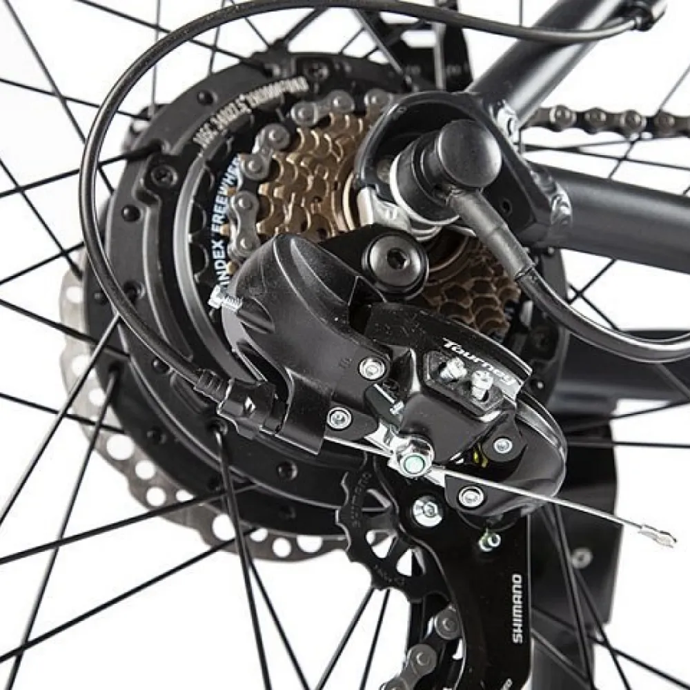 Установлены передние и задние гидравлические дисковые тормоза. На заднем колесе 7 звезд, семи-скоростной переключатель.